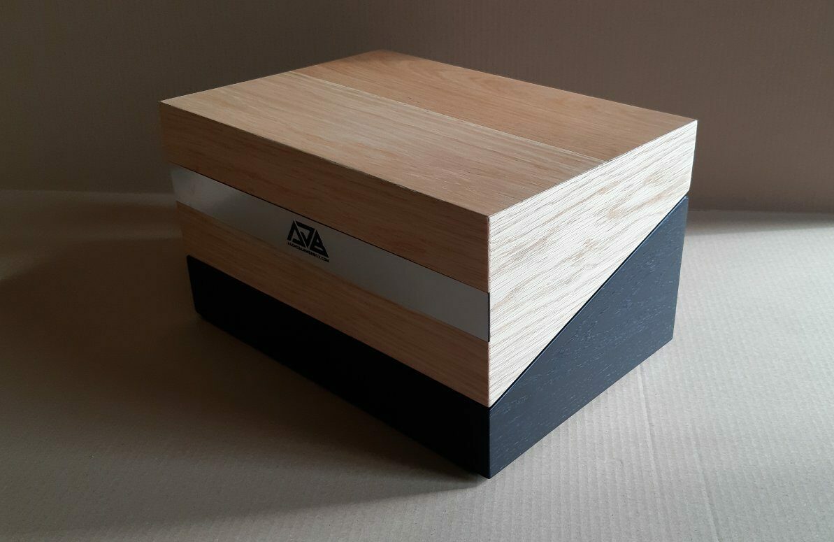Érdekessége a doboznak, egyrészt ahogyan nyílik, illetve a design-t fokozandó azon elképzelésünk, hogy az alsó rész festett, a felső pedig natúr színű lett. Belül műbőrrel vontuk be, a logót síkba mart ezüst színű gravír táblára helyeztük el.